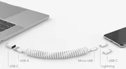 allroundo®, is a compact all-in-1 charge &, sync cable. It has an innovative 6-in-1 design and connector-combination options that make it compatible with all your devices. The 50-cm-long coiled cable is versatile and allows you to use your phone while charging. All elements (1 USB-A to Micro-USB cable, 1 MFi-certified Lightning and 2 USB-C adapters) are conveniently stored in a compact, portable case that fits into your bag or pocket and comes with a practical loop for easy attachment.