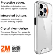 Skydd mot fallEiger Glacier Case har utformats och testats för att tåla fall från 2 meter och de upphöjda kantlisterna hjälper till att skydda din skärm.Kristallklart skyddDen unika Glacier Tec+ förhindrar att fodralet gulnar under längre tid och skyddar din enhet från repor. Tillsammans med oberoende bu